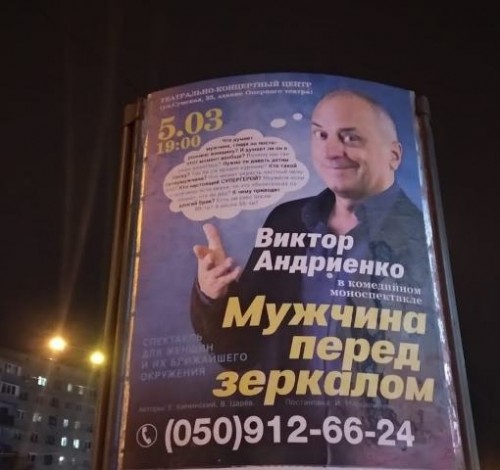 Год назад в Полтаве и Харькове, с успехом прошли премьеры моего моно-спектакля “МУЖЧИНА ПЕРЕД ЗЕРКАЛОМ”. По просьбе зрителей, решил годовщину премьеры отмечтить спектаклями в этих городах: 4 марта Полтава театр им Гоголя (улиця Соборности, 23) Начало в 19:00 5 марта, Харьков театрально-концертный центр в здании оперного театра Начало в 19:00 (улиця Сумська, 25,) ЖДУ ВСЕХ, ВСЕХ, ВСЕХ Искренне Ваш - Виктор Андриенко |